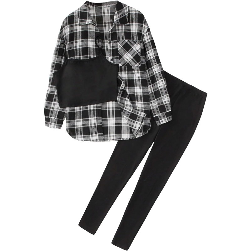 Floerns Girls Clothes 3 Piece Outfit Cami Top Pants Set with Plaid Print Shirt(Black and White)