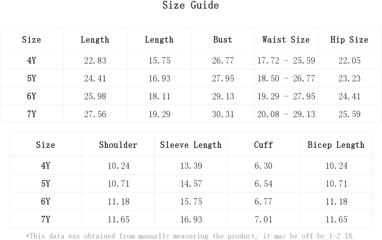 6 Years: Bicep Length: 11.2″, Bust: 29.1″, Cuff: 6.8″, Length: 18.1″, Shoulder: 11.2″, Sleeve Length: 15.7″