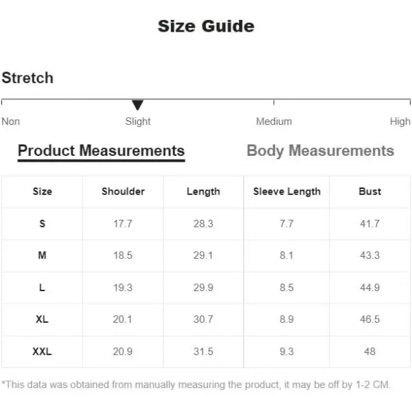 Size Chart: Small:Shoulder:21.9″, Length:27.4″, Sleeve Length:8.7″, Bust:43.1″/ Medium:Shoulder:22.6″, Length:28.1″, Sleeve Length:8.9″, Bust:44.7″/ Large:Shoulder:23.6″, Length:28.9″, Sleeve Length:9″, Bust:46.7″/ X-Large:Shoulder:24.6″, Length:29.7″, Sleeve Length:9.1″, Bust:48.6″/ XX-Large: Shoulder:25.6″, Length:30.5″, Sleeve Length:9.2″, Bust:50.6″/