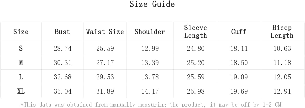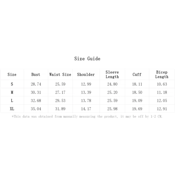 XL:Bicep Length:12.9IN,Bust:35.0IN,Cuff:19.7IN,Shoulder:14.2IN,Sleeve Length:26.0IN,Waist Size:31.9IN