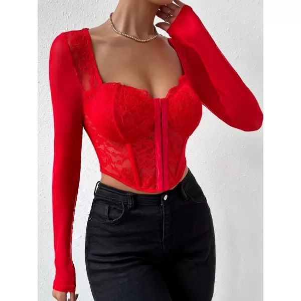 Floerns Women’s Asymmetrical Hem Long Sleeve Bustier Lace Tee Shirt Crop Top(Red)