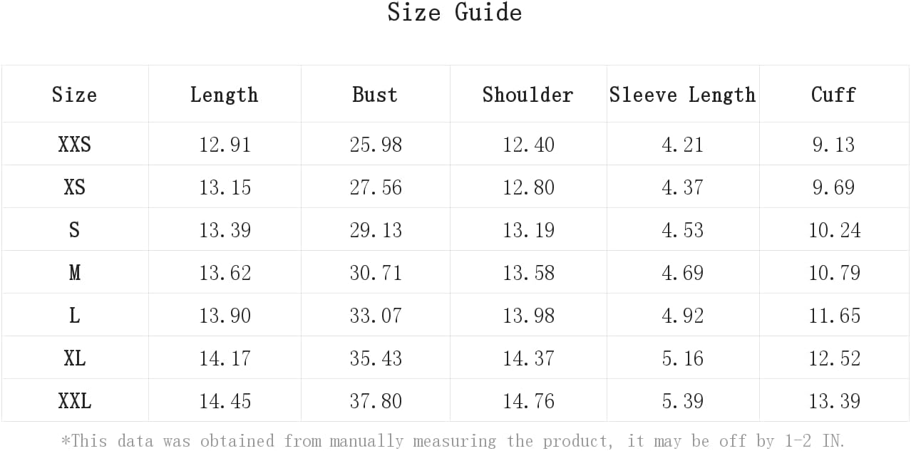 X-Small: Bust: 27.6″, Cuff: 9.7″, Length: 13.1″, Shoulder: 12.8″, Sleeve Length: 4.4″