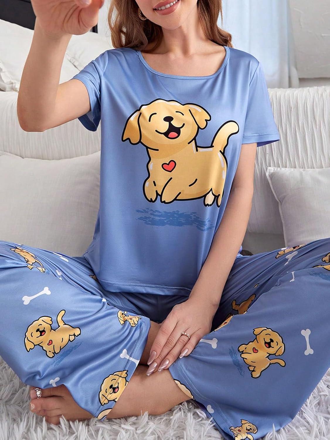 Floerns Women’s Cartoon Print Short Sleeve Top with Long Pants Two Piece Pajama Sets(Mauve Purple Dog)