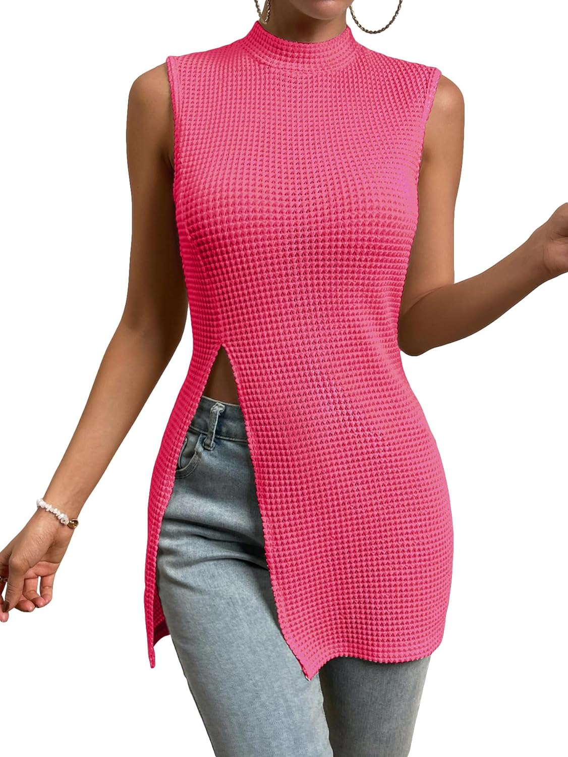 Floerns Women’s Casual Sleeveless Mock Neck Split Hem Tank Top(Hot Pink)