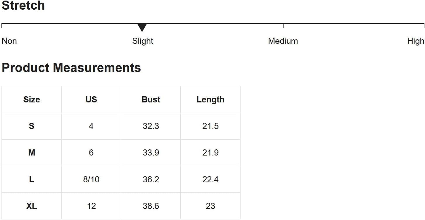 Size Chart: Small:Bust:32.3″, Length:21.5″/ Medium:Bust:33.9″, Length:21.9″/ Large:Bust:36.2″, Length:22.4″/ X-Large:Bust:38.6″, Length:23″/