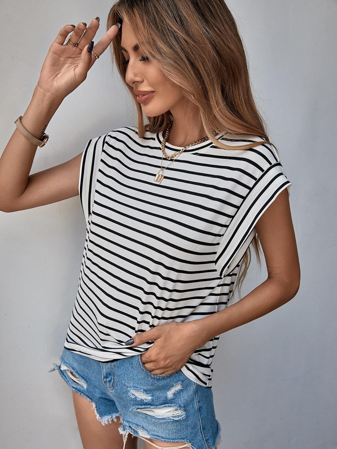 Floerns Women’s Casual Stripe Print Batwing Sleeve T Shirts Round Neck Tee(Black and White)