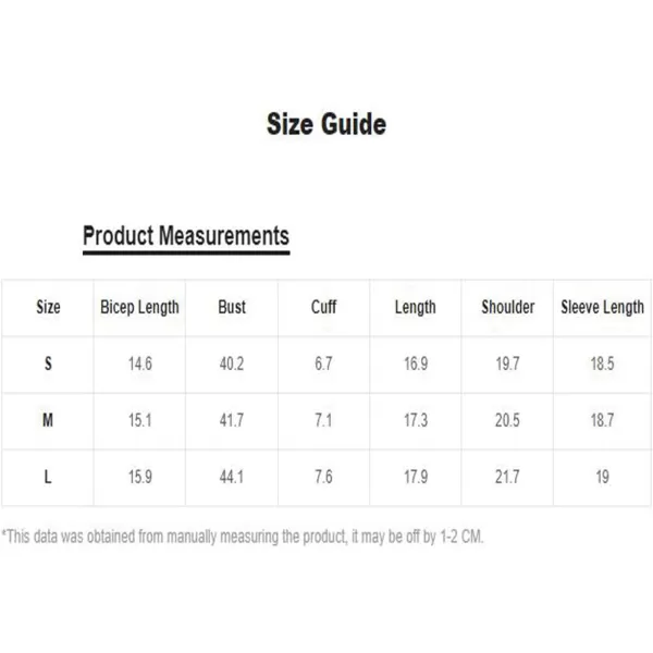 Small: Bicep Length: 14.6″, Bust: 40.2″, Cuff: 6.7″, Length: 16.9″, Shoulder: 19.7″, Sleeve Length: 18.5″