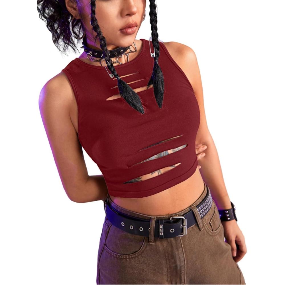 Get up to 50% off on Floerns Women’s Cut Out Sleeveless Round Neck Punk Rock Solid Ripped Crop Tank Top(Rose Purple) styles during our spring sale event.