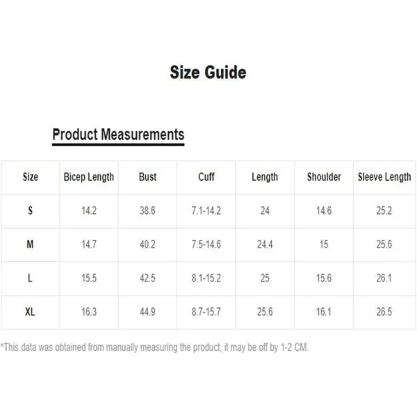 Large: Shoulder: 15.6″, Length: 25.0″, Sleeve Length: 26.1″, Bust: 42.5″, Cuff: 8.1-15.2″, Bicep Length: 15.5″