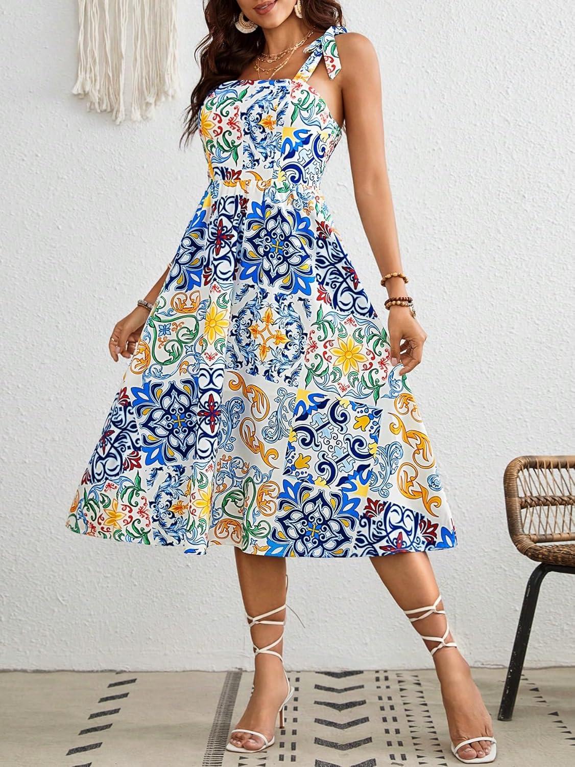 Floerns Women’s Floral Print Tie Strap Square Neck Ruffle Boho Maxi Dress(Blue Floral)