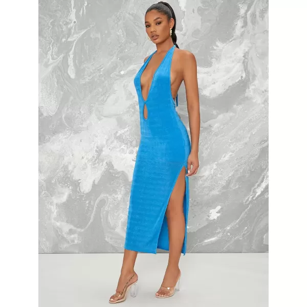 Floerns Women’s Halter Neck Sleeveless Split Thigh Party Bodycon Long Dress(Blue)