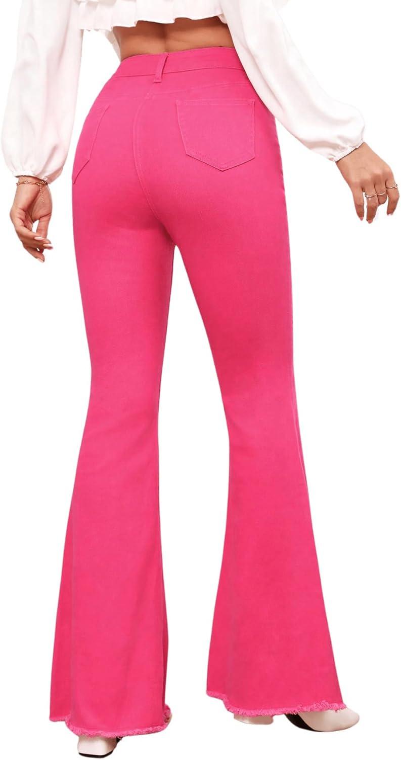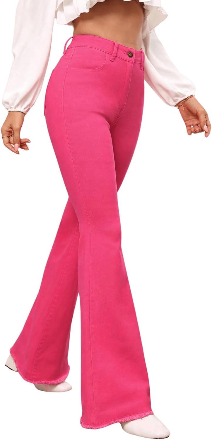 Floerns Women’s High Waisted Flare Jeans Frayed Raw Hem Bell Bottom Denim Pants(Hot Pink)