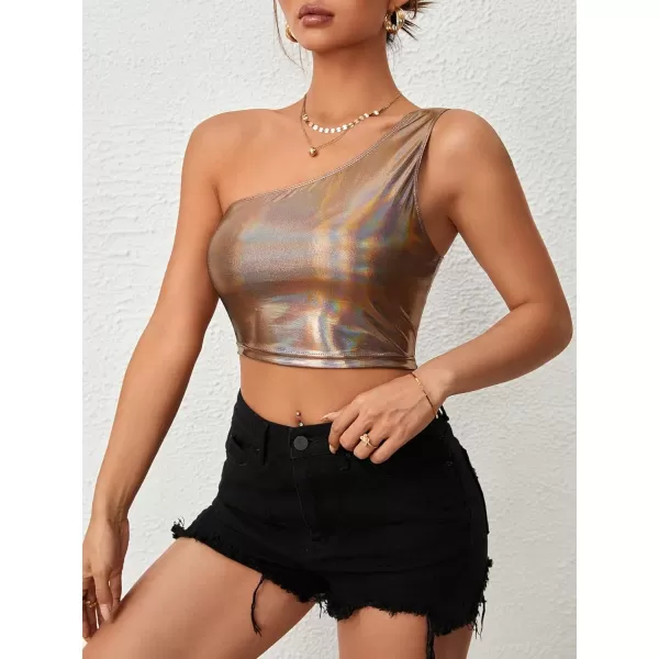Floerns Women’s One Shoulder Sleeveless Holographic Metallic Crop Tank Top(Gold)