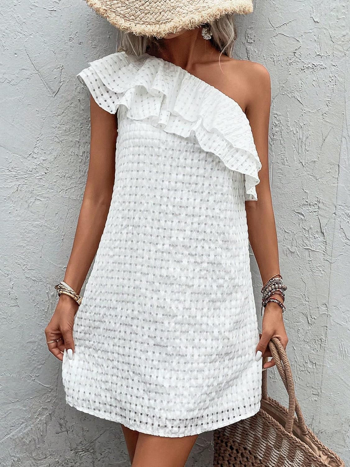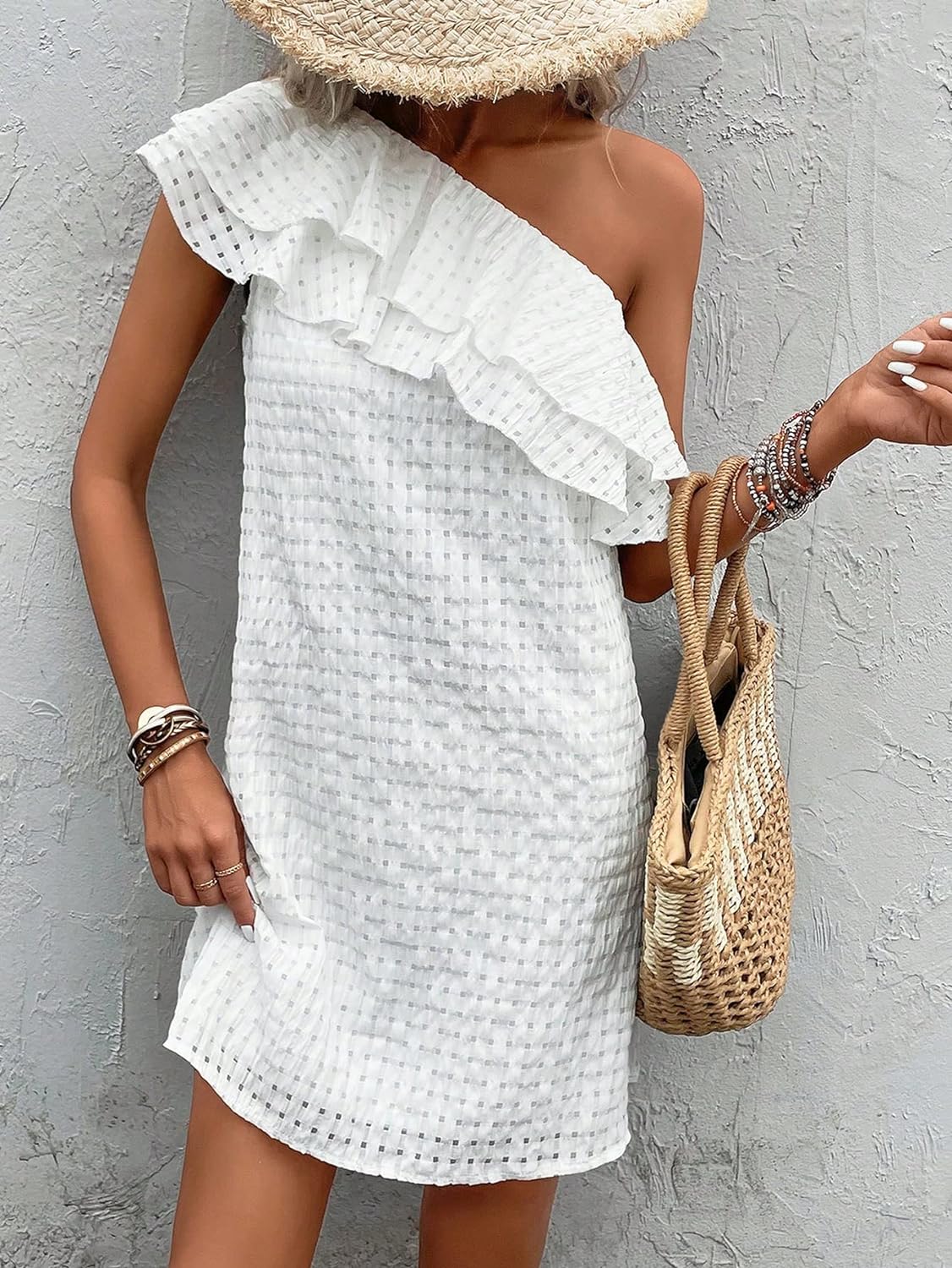 Floerns Women’s One Shoulder Tiered Layered Sleeveless Ruffle Trim Tunic Dress(White)