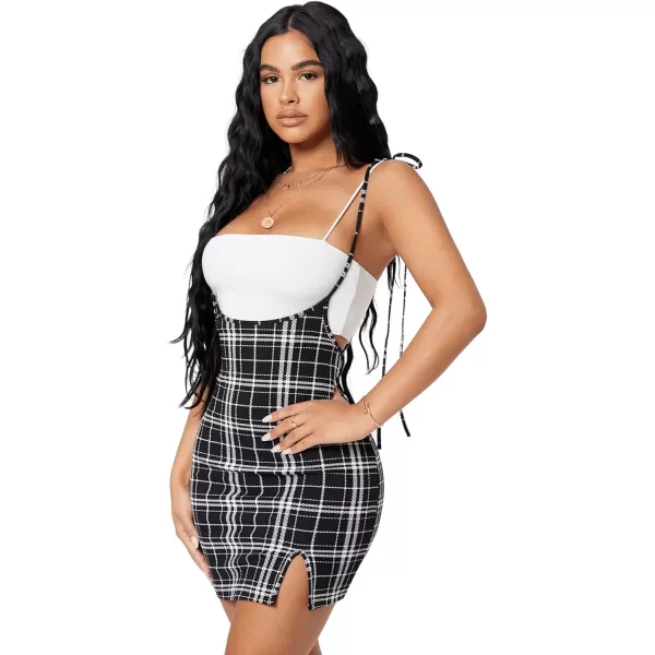 Floerns Women’s Plaid Suspender Skirt Tie Shoulder Split Hem Overall Bodycon Mini Dress(Black White Tartan)