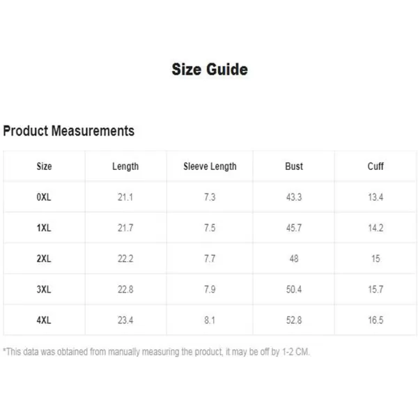 Size Chart: Large Plus: Length:27.4″, Sleeve Length:7.3″, Bust:42.7″, Cuff:27.8″/ X-Large Plus: Length:28″, Sleeve Length:7.5″, Bust:45.1″, Cuff:28.7″/ XX-Large Plus: Length:28.5″, Sleeve Length:7.6″, Bust:47.4″, Cuff:29.6″/ 3X-Large Plus: Length:29.1″, Sleeve Length:7.8″, Bust:49.8″, Cuff:30.6″/ 4X-Large Plus: Length:29.7″, Sleeve Length:7.9″, Bust:52.2″, Cuff:31.5″/