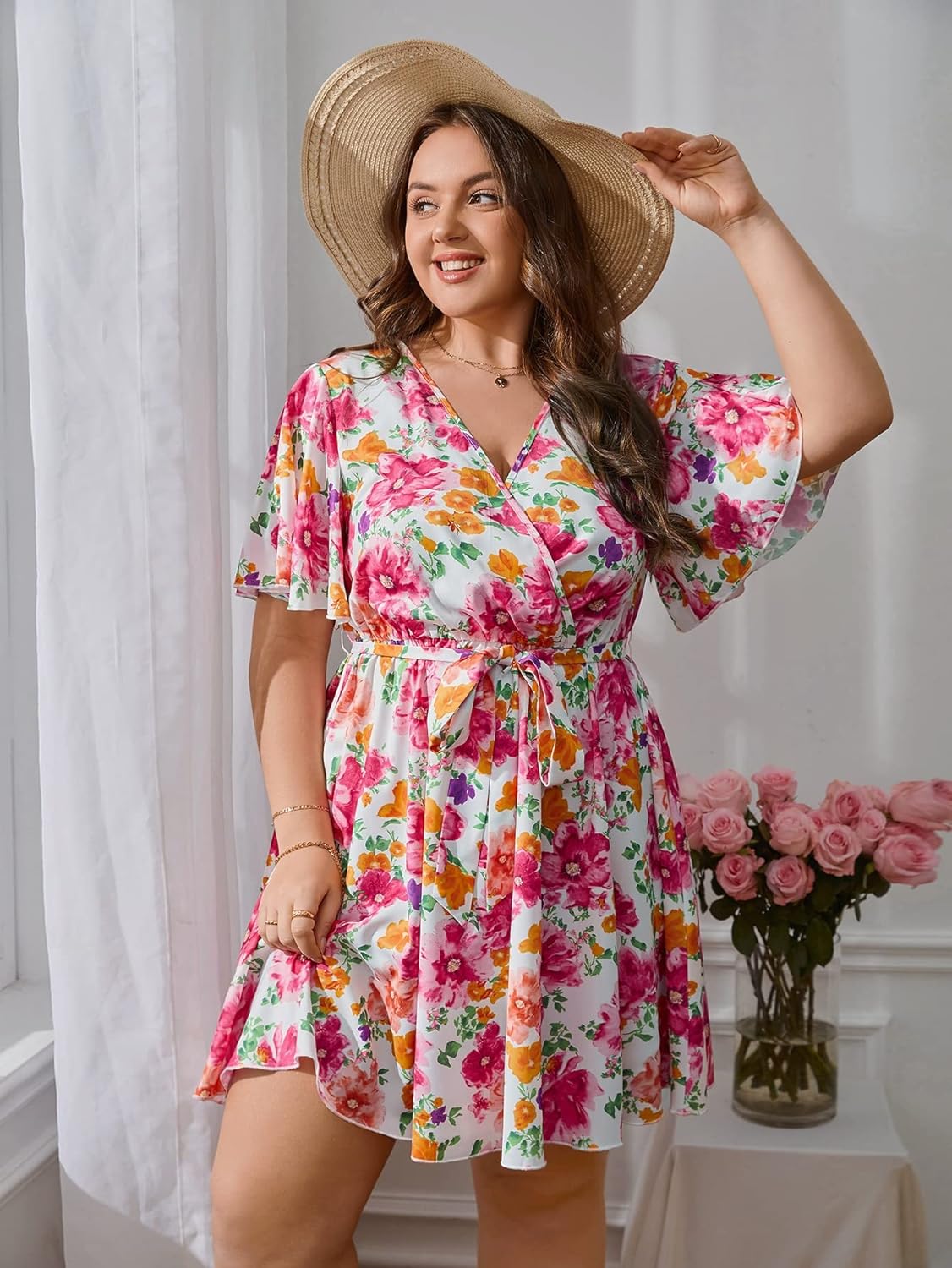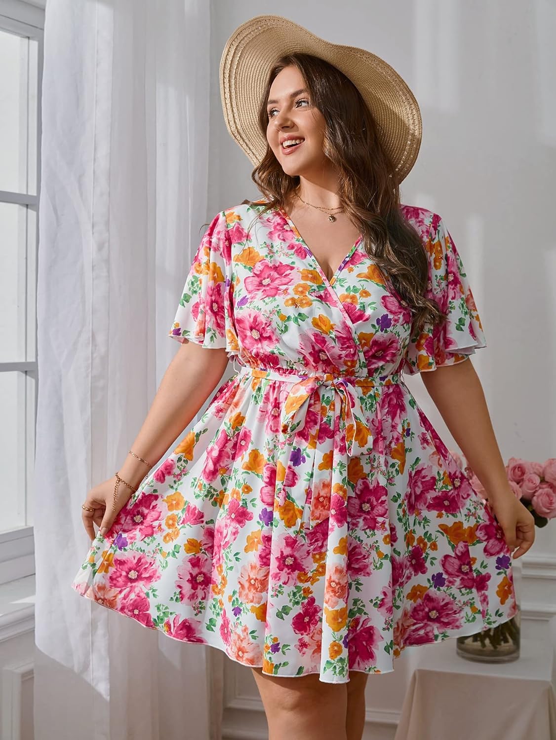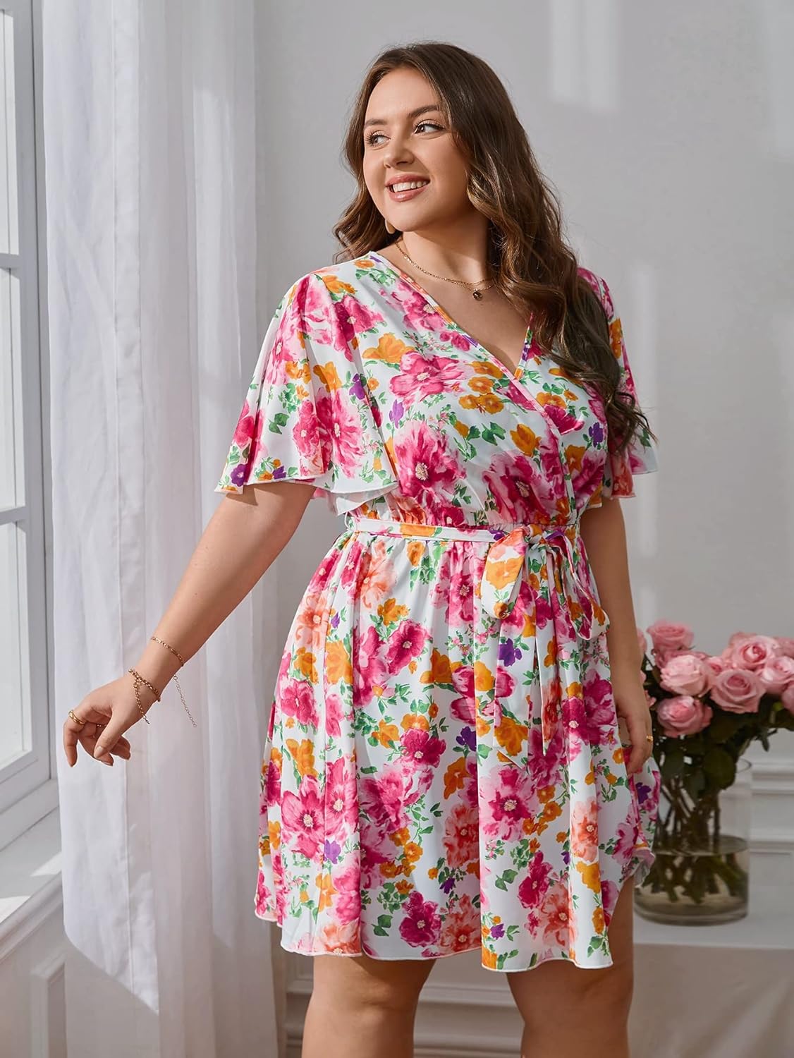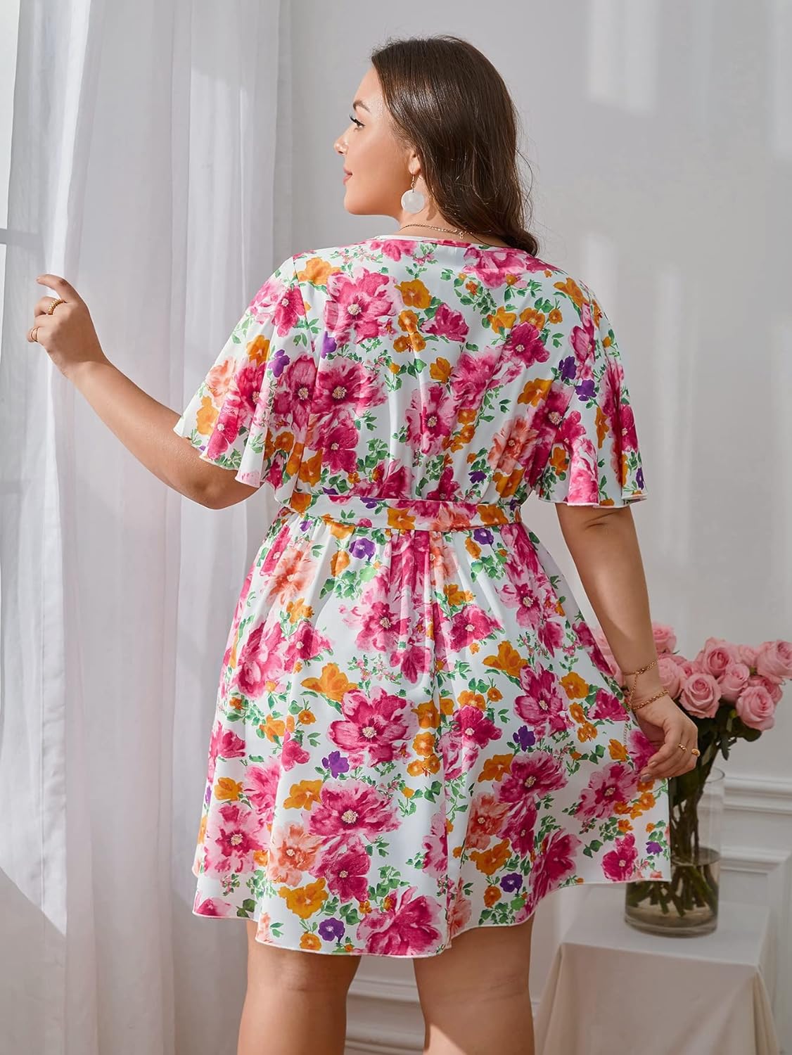Floerns Women’s Plus Size Boho Floral Wrap V Neck Short Sleeve A Line Dress(Pink Flower)