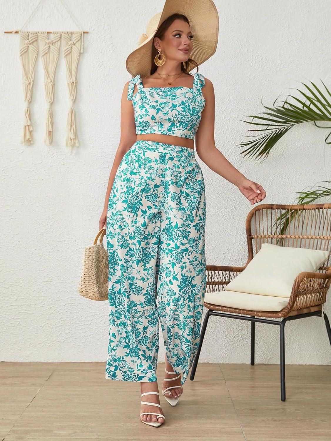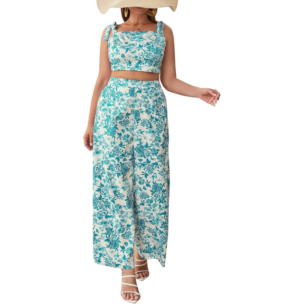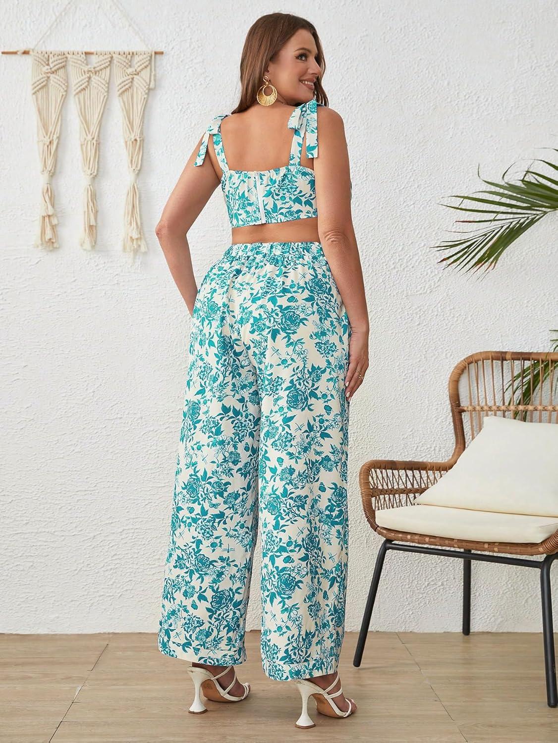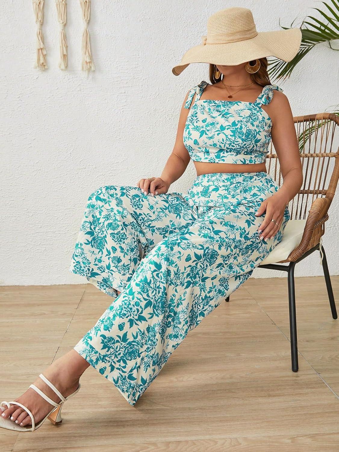 Floerns Women’s Plus Size Floral Tie Shoulder Crop Tops Wide Leg Pants 2 Piece Summer Sets(Mint Blue Multi)