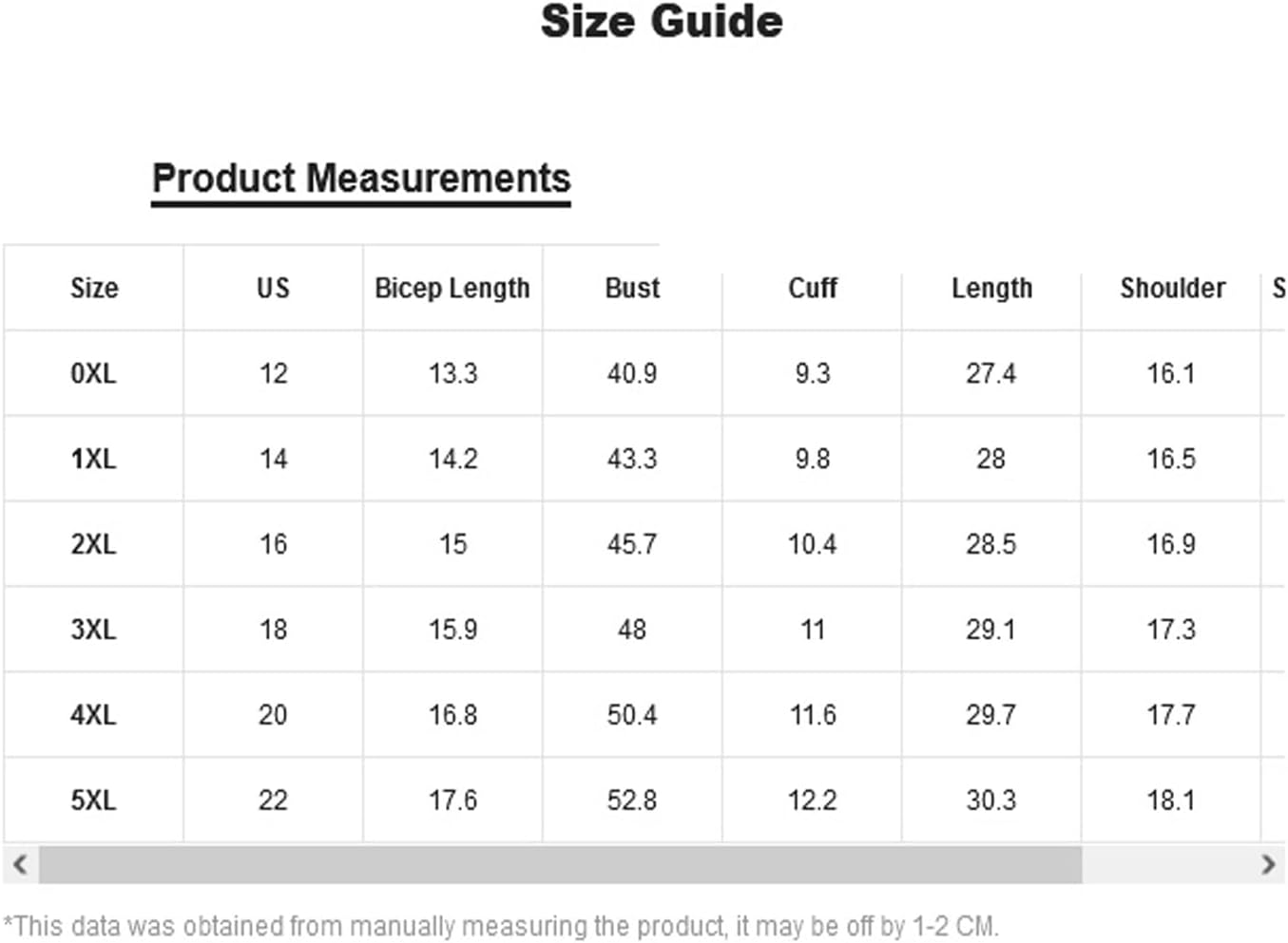 5X-Large Plus: Bicep Length: 17.6″, Bust: 52.8″, Cuff: 12.2″, Length: 30.3″, Shoulder: 18.1″, Sleeve Length: 26.4″