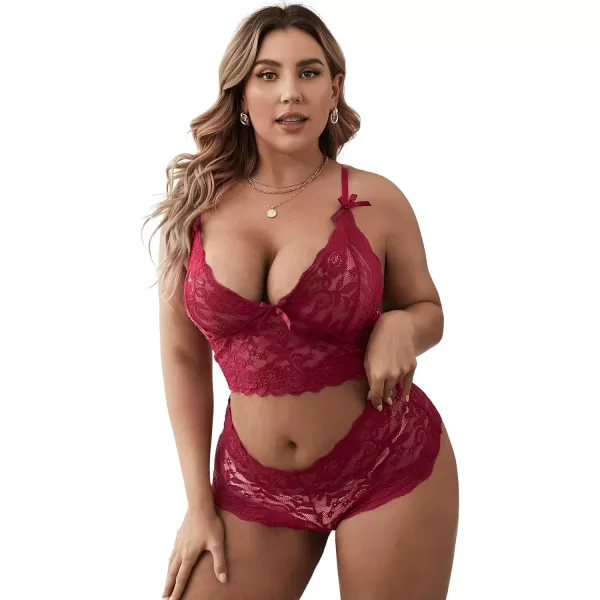 Floerns Women’s Plus Size Lingerie Set Floral Lace Bralette and Panty Underwear(A-burgundy)