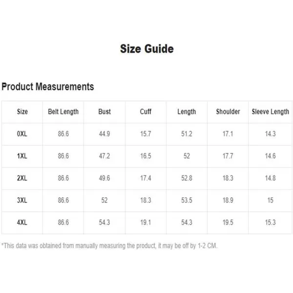3X-Large Plus: Shoulder: 26.8″, Length: 54.7″, Sleeve Length: 16.4″, Bust: 57.5″