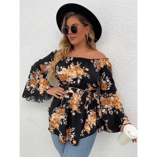 Floerns Women’s Plus Size Off Shoulder Long Bell Sleeve Peplum Blouse Top(Black Floral)