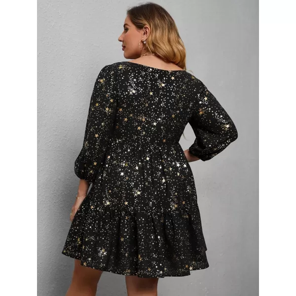 Floerns Women’s Plus Size Printed Casual Square Neck Puff Sleeve A Line Dress(Black and Galaxy)