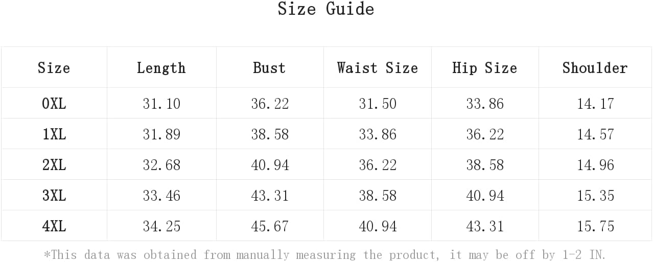 4XL:Bust:45.7IN,Hip Size:43.3IN,Length:34.3IN,Shoulder:15.7IN,Waist Size:40.9IN