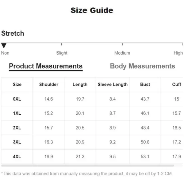 XX-Large Plus: Shoulder:17.1″, Length:18.3″, Sleeve Length:8.9″, Bust:48.8″, Cuff:17.3″