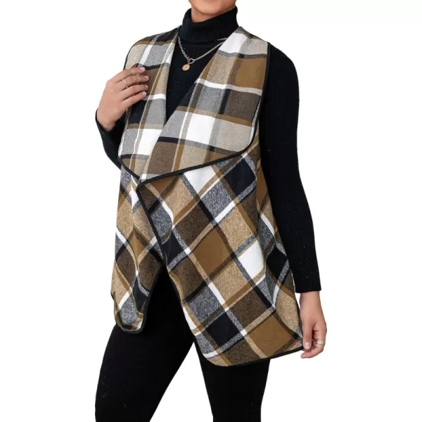 Floerns Women’s Plus Size Plaid Print Waterfall Collar Open Front Vest Jacket(Brown Multi)