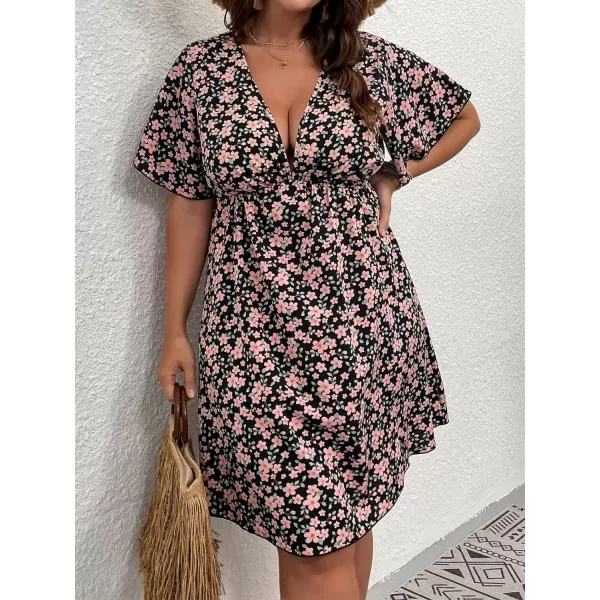 Floerns Women’s Plus Size Striped Print Wrap V Neck Short Sleeve A Line Dress(Ditsy Floral Black)