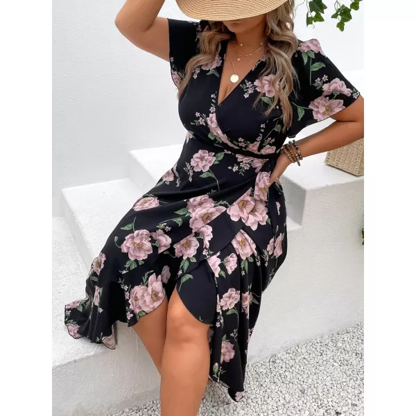 Floerns Women’s Plus Size Striped Print Wrap V Neck Short Sleeve A Line Dress(Black Purple Floral)