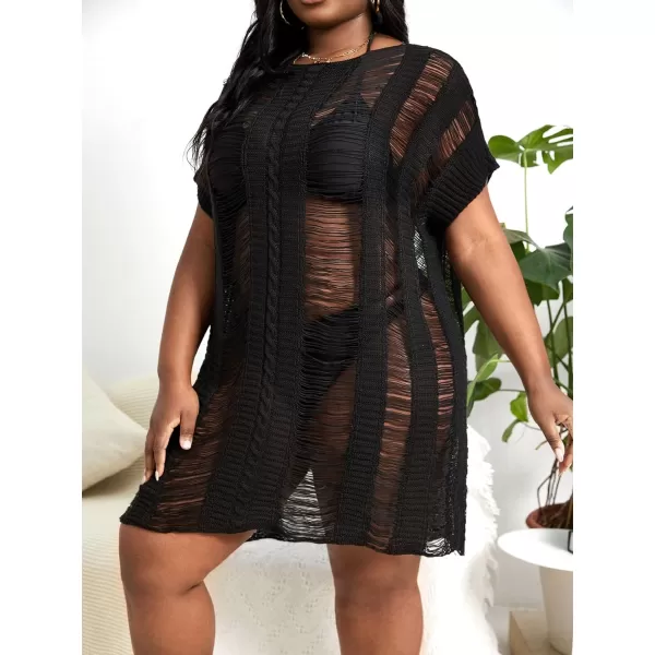 Floerns Women’s Plus Size V Neck Fringe Trim Slit Hem Cover Up Swimwear(Black)