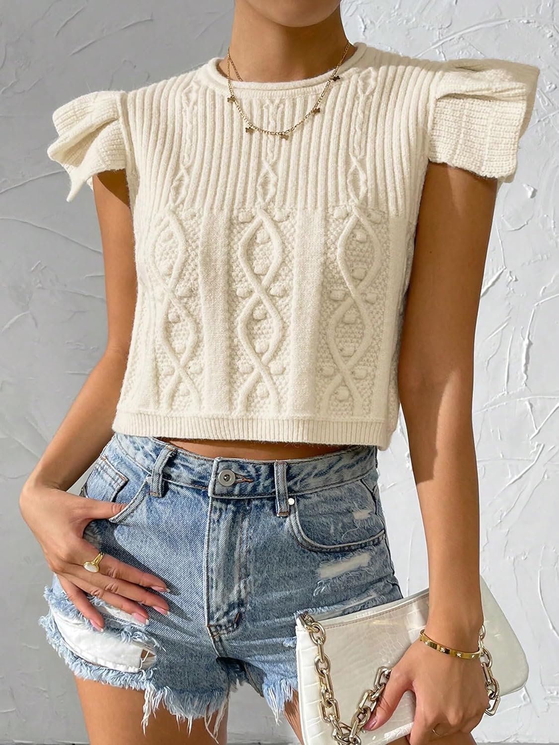 Floerns Women’s Rib Knitted Flutter Sleeve Textured Crew Neck Sweater Crop Tank Tops(Apricot)