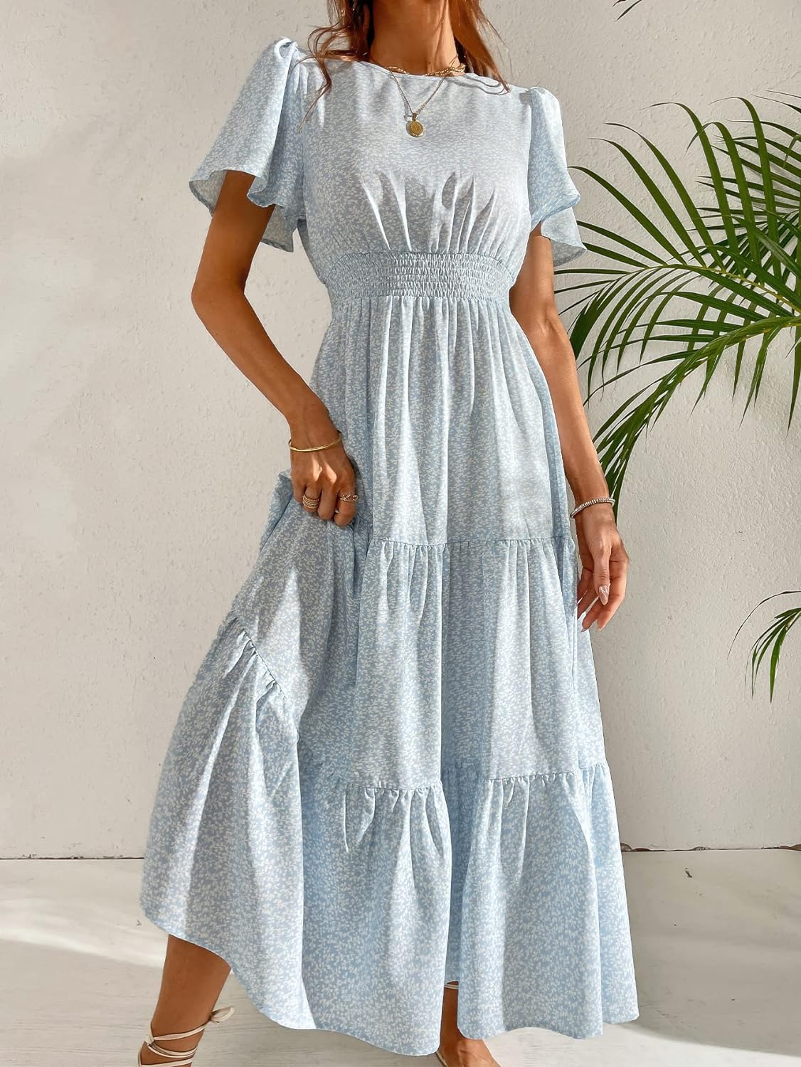 Floerns Women’s Short Sleeve Boho Floral Dress A Line Smocked Midi Dress(B Light Blue)