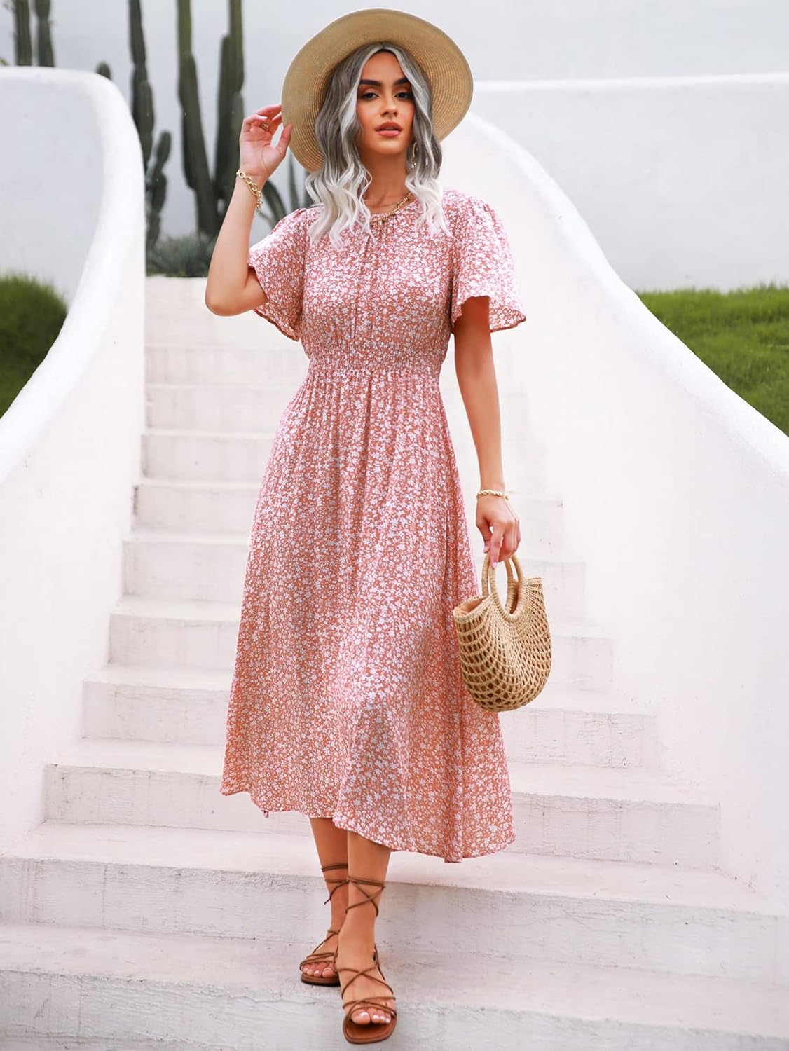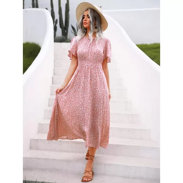 Floerns Women’s Short Sleeve Boho Floral Dress A Line Smocked Midi Dress(B-light Pink Floral)