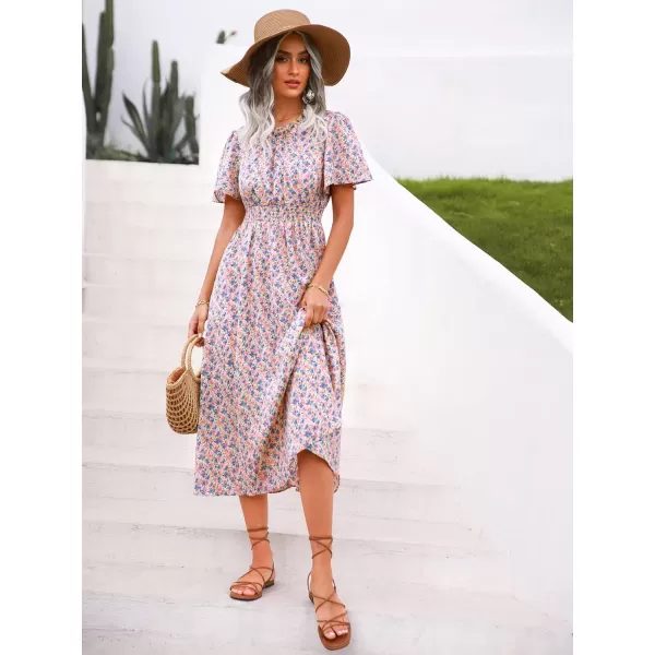 Floerns Women’s Short Sleeve Boho Floral Dress A Line Smocked Midi Dress(B-pink Blue Multi)