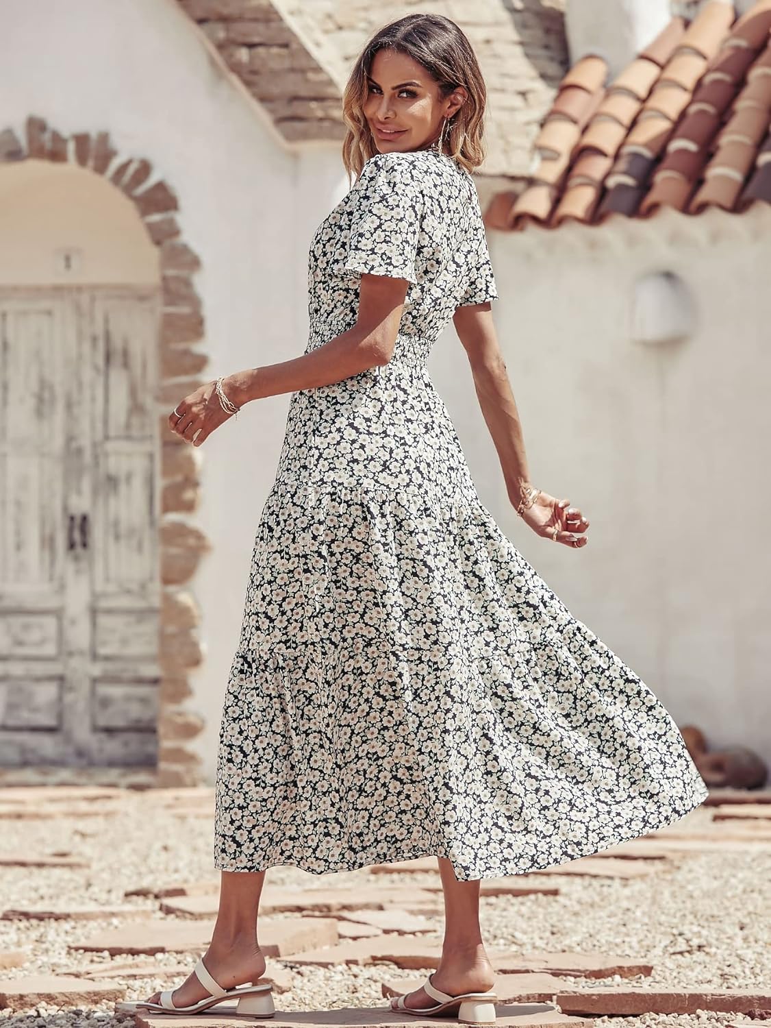 Floerns Women’s Short Sleeve Boho Floral Dress A Line Smocked Midi Dress(Black Flower)