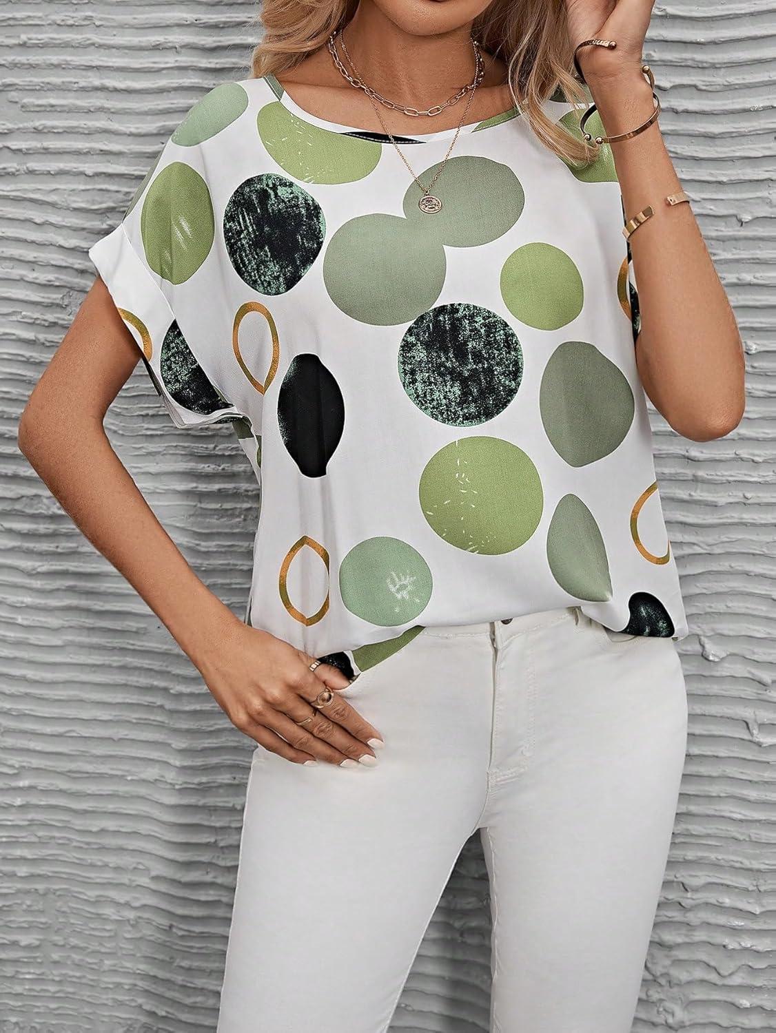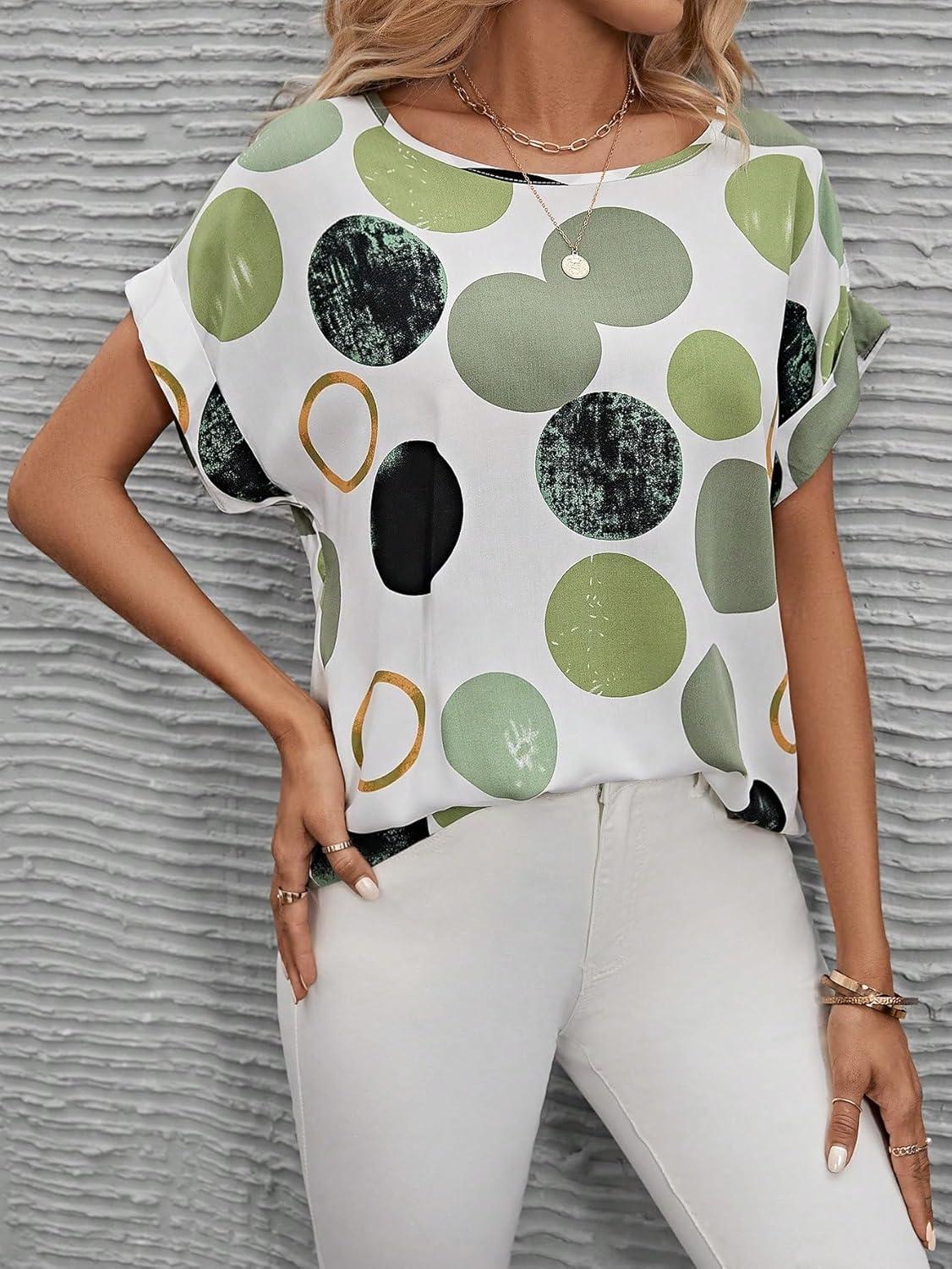 Floerns Women’s Short Sleeve Office Blouse(White Green Polka Dots)