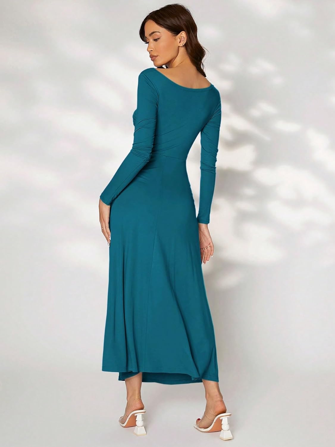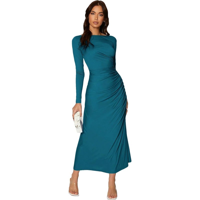 Floerns Women’s Solid Boat Neck Long Sleeve Ruched Side Party A Line Long Dress(Teal Blue Solid)