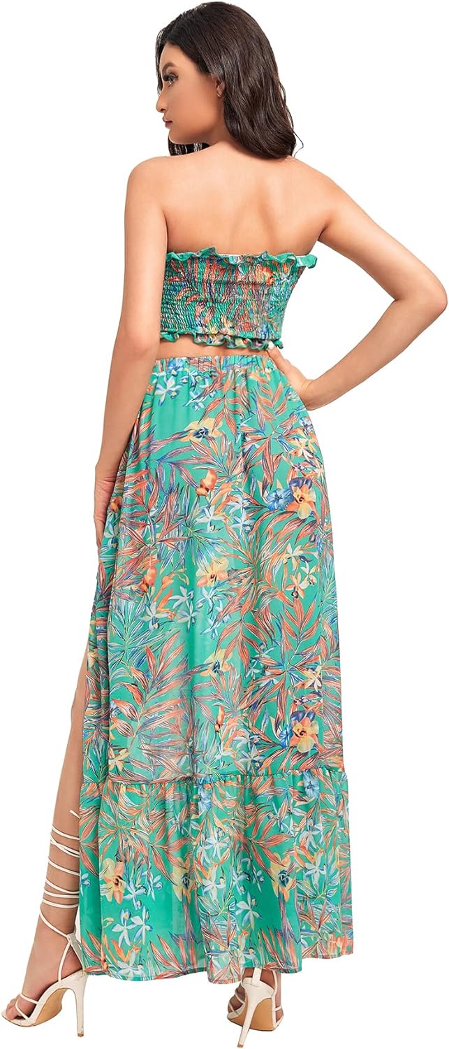 Floerns Women’s Summer Printed 2 Piece Outfit Crop Tube Tops and Split Long Skirt Set(Green Floral)