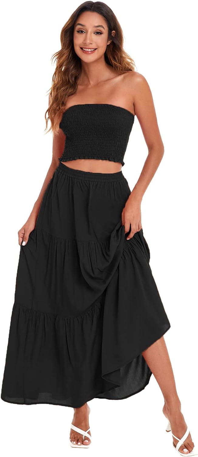 Floerns Women’s Summer Printed 2 Piece Outfit Crop Tube Tops and Split Long Skirt Set(Solid Black)