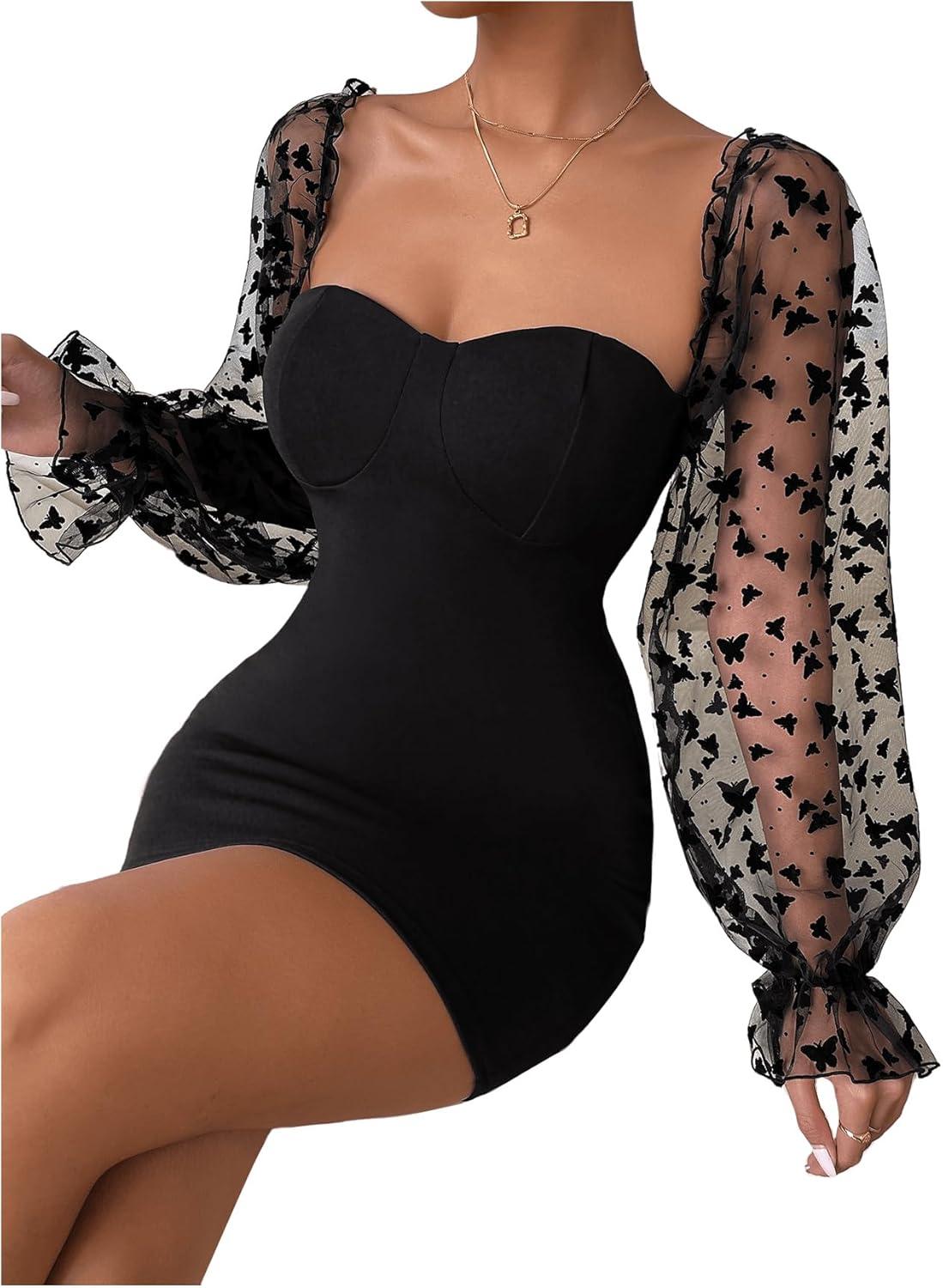 Floerns Women’s Sweetheart Neck Mesh Sheer Ruffle Long Sleeve Bodycon Mini Dress(Black Solid)