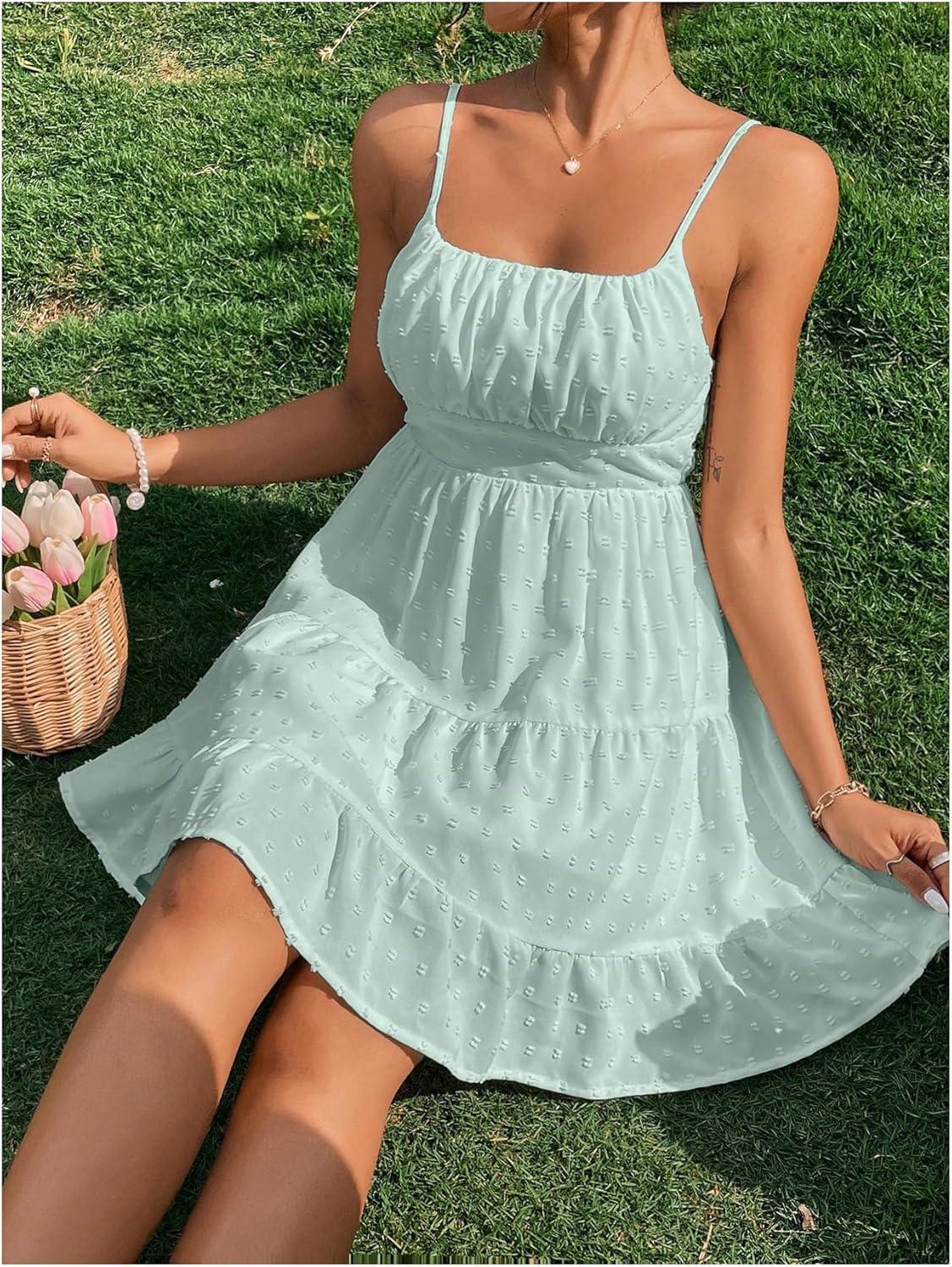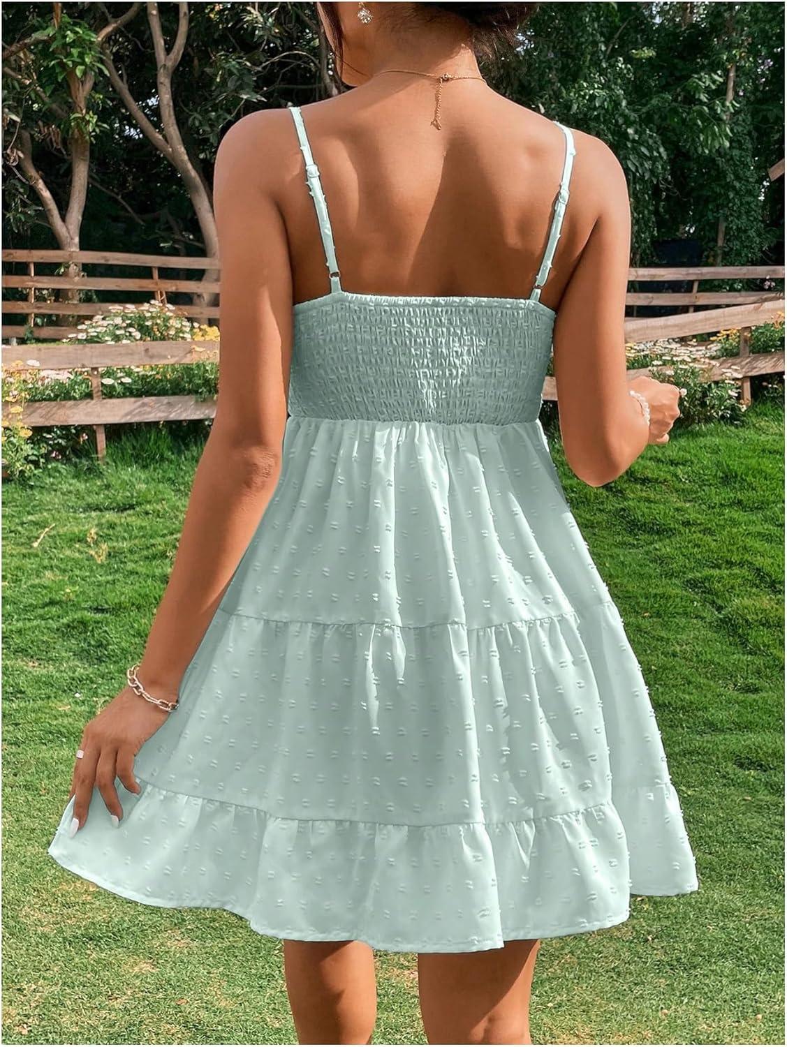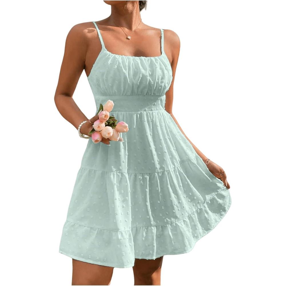 Get up to 60% off on Floerns Women’s Swiss Dots Sleeveless Ruched Bust Ruffle Hem Cami Short Dress(Mint Green) styles during our winter sale event.